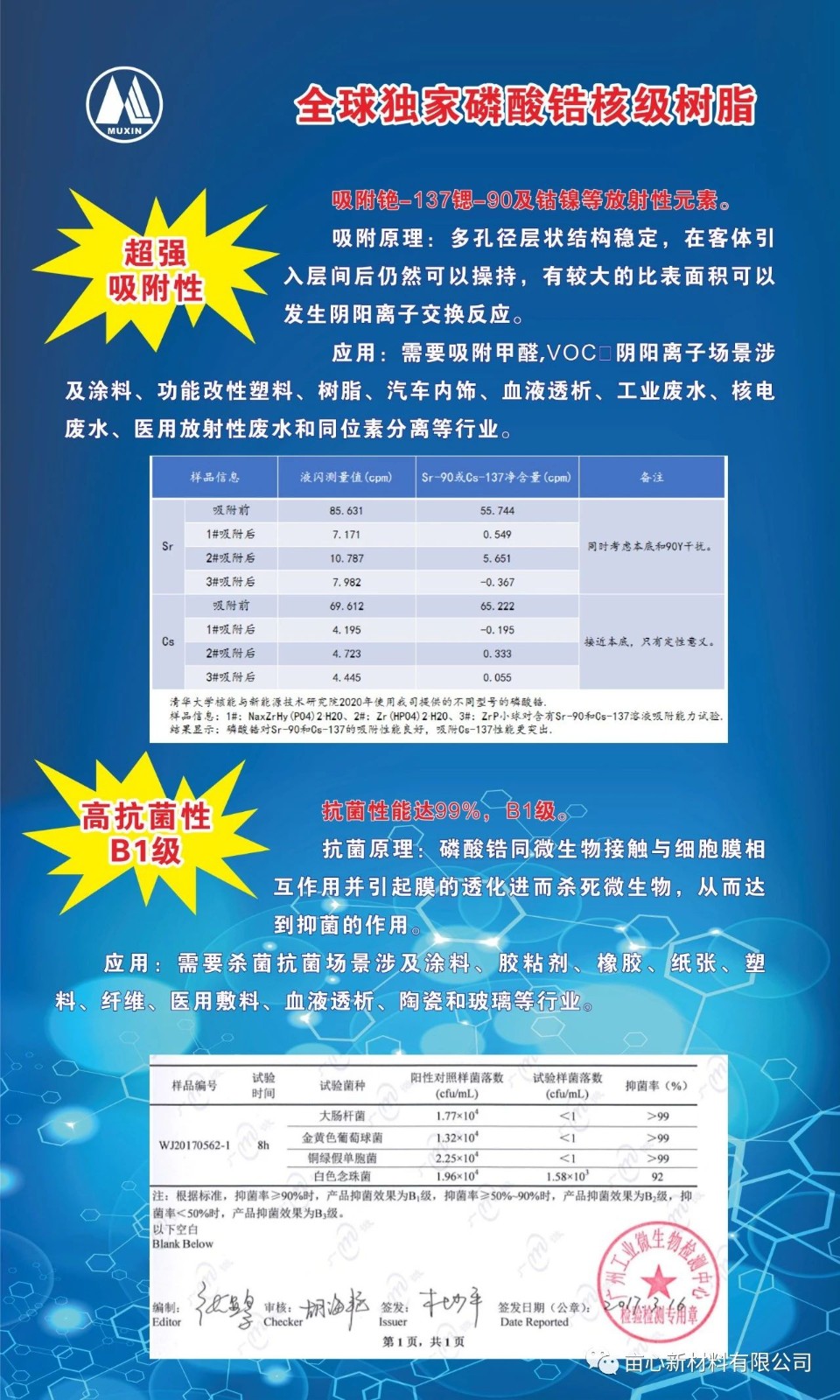 四川畝心新材料有限公司(英文名:“Resin&Zircon Technology Co., Ltd.”)是全球獨家生產磷酸鋯系列功能樹脂的高新技術企業,我們提供磷酸鋯核級樹脂、通用樹脂、醫療放射性廢水一站式處理解決方案。